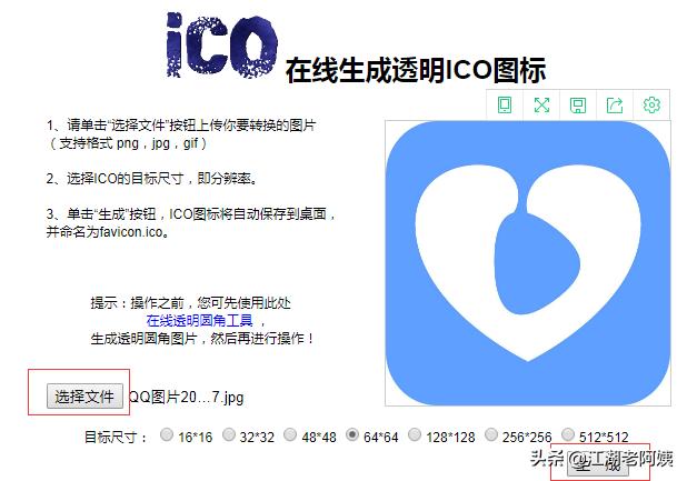 3.我们需要提前准备好自己需要的图标,点击【选择文件】,找到桌面需要制作成ico的图片,导入后点击右下角【生成】如下图所示: