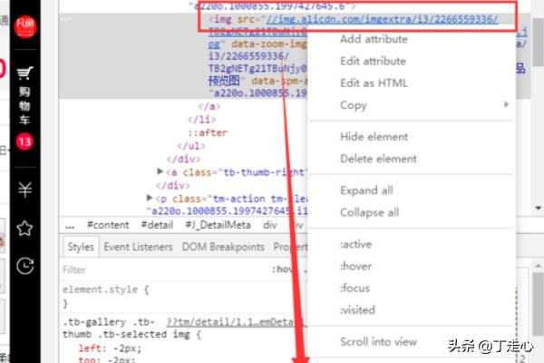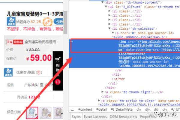 2.点击【检查】后,在浏览器右侧会出现一个分屏,里面默认会选中一块对应这张主图的代码。红框位置圈的就是想要下载的这张图片的链接。