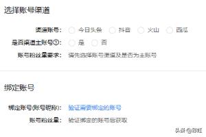 2、勾选渠道账号,选择是否为渠道主账号。如选择为渠道主账号,则此账号将用于渠道开通标准审核。主账号绑定成功后渠道才算开通成功,可以继续绑定此渠道的其他账号。若选择“否”非渠道主账号,则作为普通媒体号绑定,不校验粉丝数量。