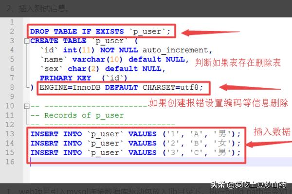 创建表语句,插入测试信息。